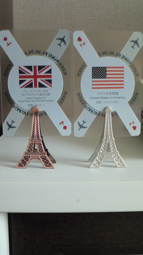48ヵ国の国旗が描かれたトランプなんです。白いとこ以外は半透明で、なかなかおしゃれさんでしょ。エッフェル塔のメモクリップも可愛くて買ってしまった。